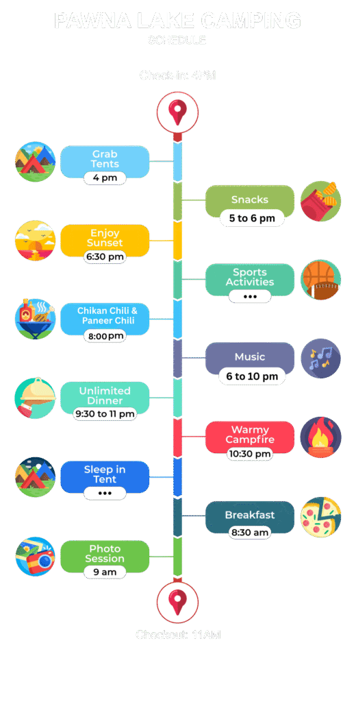 To make your trip truly memorable, we provide exciting Pawna Lake camping activities such as evening snacks & tea, sports activities anytime, enjoying sunset point, delicious starters, unlimited dinner, bonfire, DJ & live music, morning breakfast, and photography services. With a perfect blend of adventure, entertainment, and relaxation, Pawna Lake Camping is more than just a weekend getaway—it’s an experience of lakeside camping in Lonavala that creates memories to cherish forever.